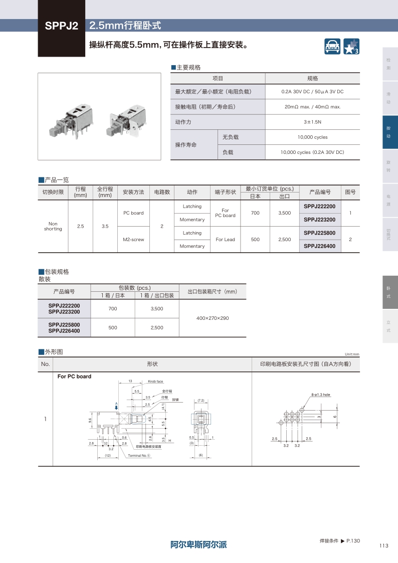 Non shorting | 2.5mm | 3.5mm | 3±1.5N | PC board | 2 | Latching | For PC board | 12.0×7.2×9.6mm |