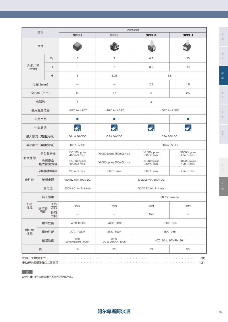 易于使用的中型立式。操作方向:Vertical ? 最大額定值:0.1A 30V DC ? 行程:2.2mm ? 電路數:2-pole。