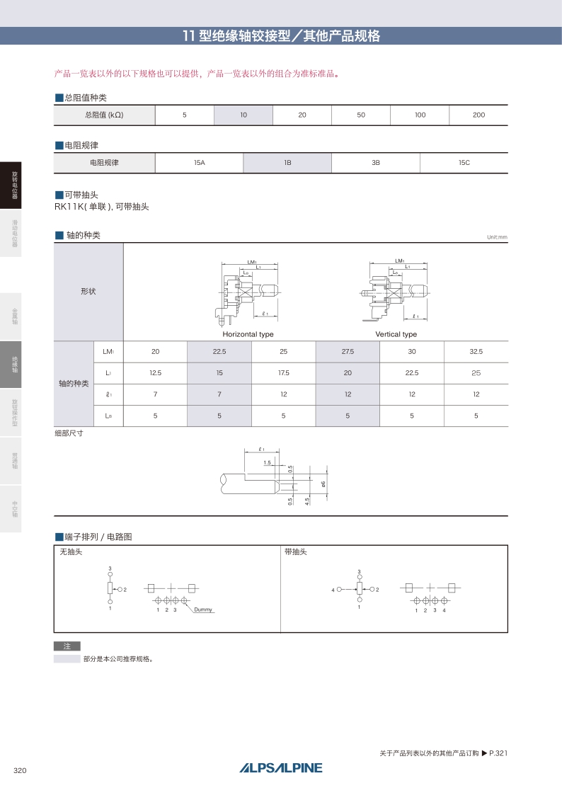 RK11K系列廣泛應對音響,影像設備,電子樂器等的本體寬度11mm型。型:絕緣軸鉸接 ? 外形尺寸:11型 ? 電阻體數:單聯 ? 附屬開關:無。