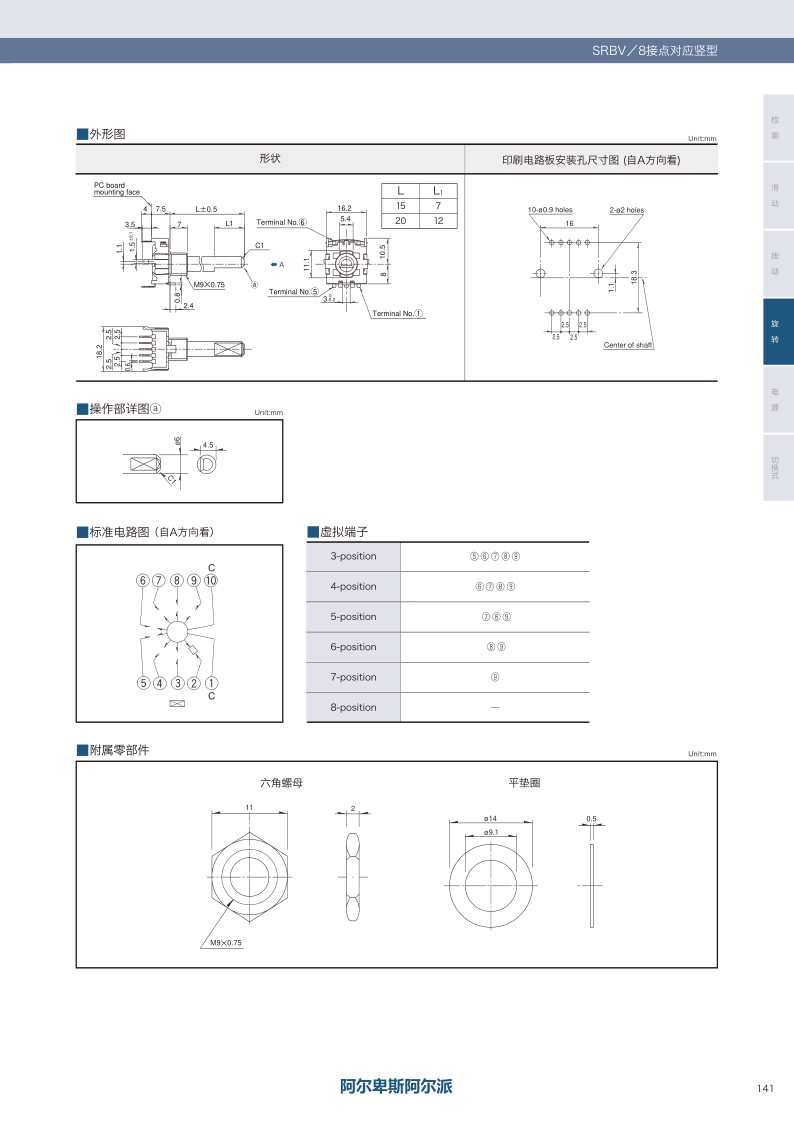 為提高組合部件設計的自由度做出了貢獻的本體高度7.5mm的薄型。位置數:3 to 8 ? 操作方向:Vertical ? 切換角度:30±3° ? 電路數:1-pole ? 最大額定值:0.3A 16V DC。