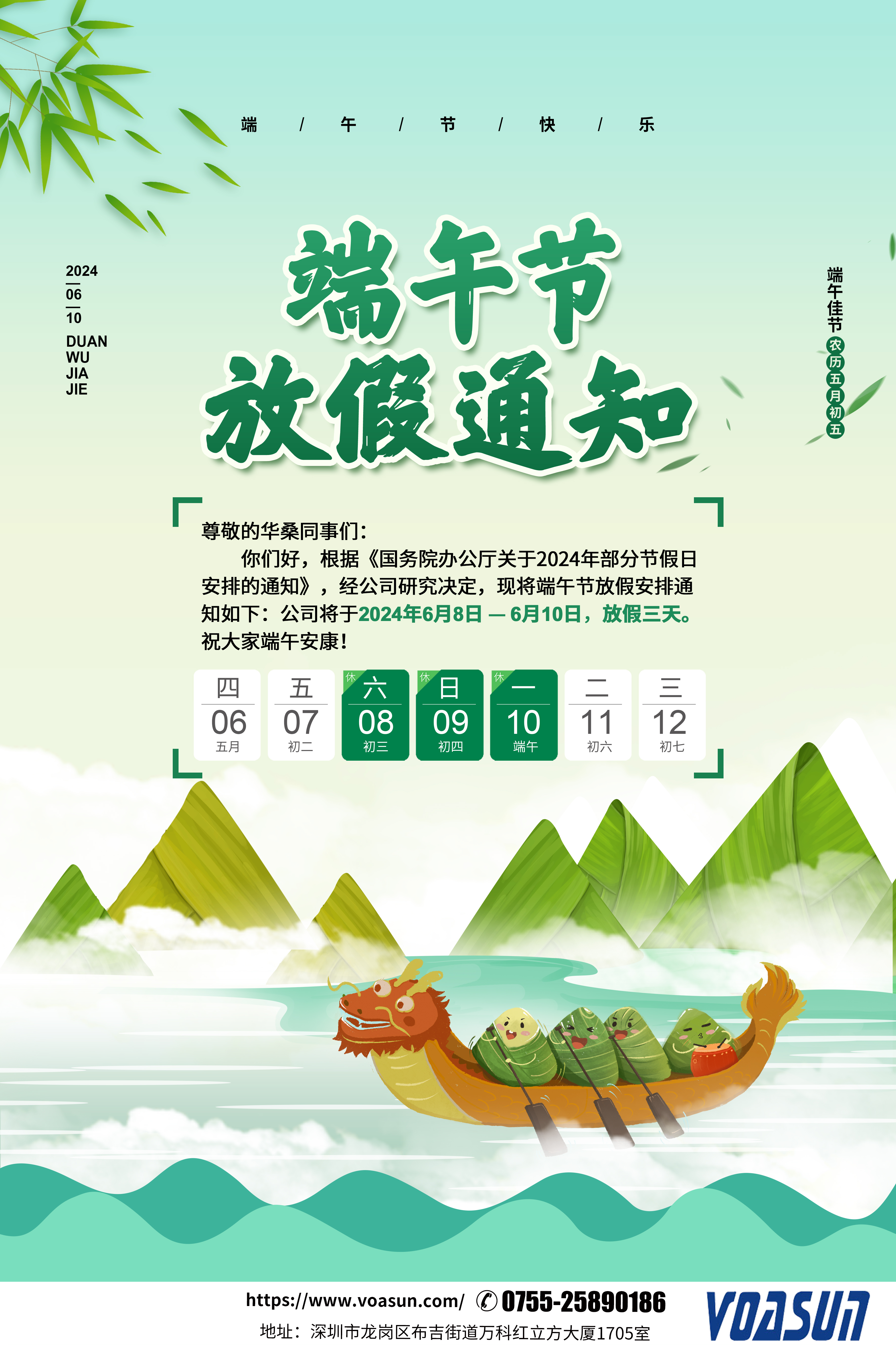 根據國家及公司相關規定,端午節放假安排:8日、9日、10日放假,共3天。